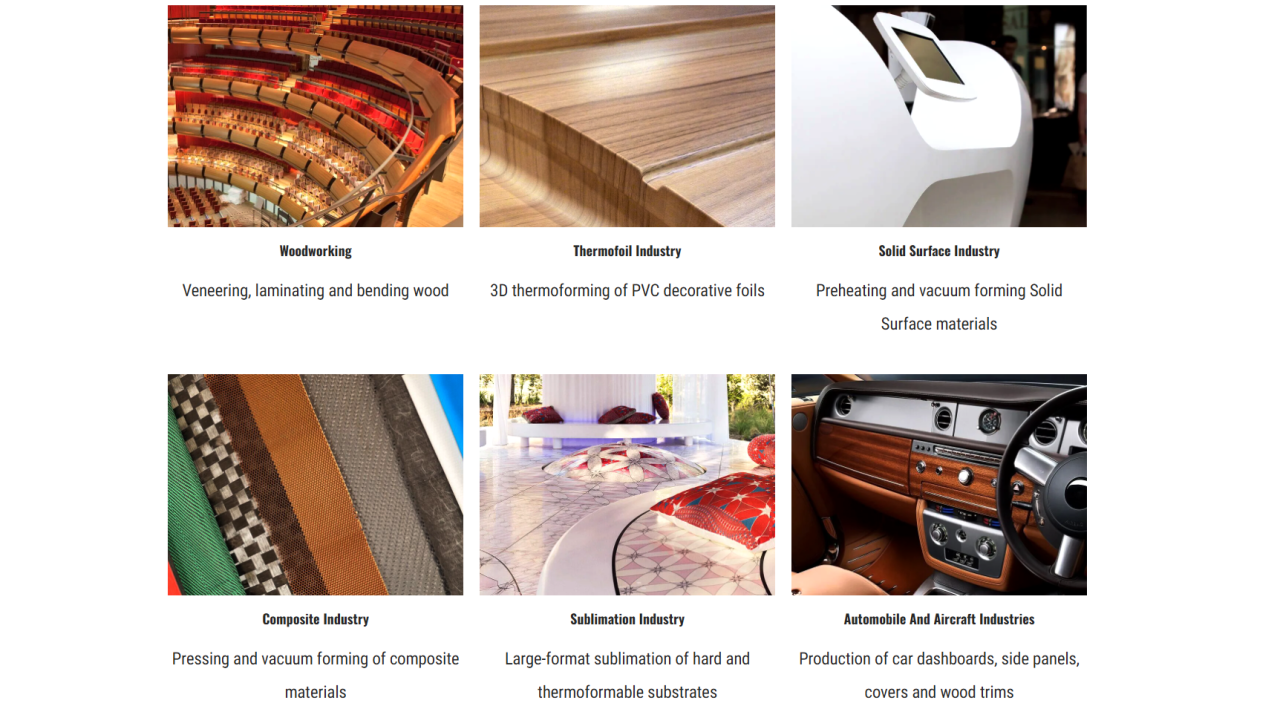 Use for PVC laminating, Wood veneering, Wood bending, Solid surface and thermoplastic material forming and thermoforming
